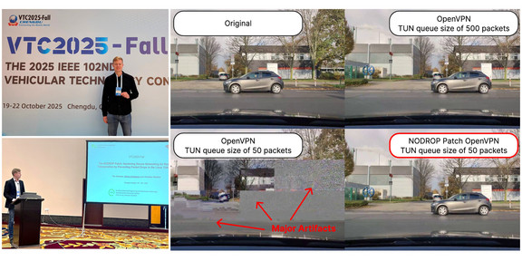 The presentation demonstrated live results comparing standard OpenVPN configurations with and without the NODROP Patch, clearly illustrating its benefit for resilient and low-latency teleoperation scenarios such as remote vehicle control.